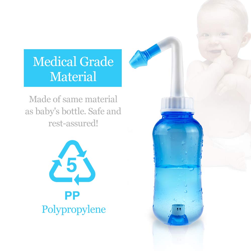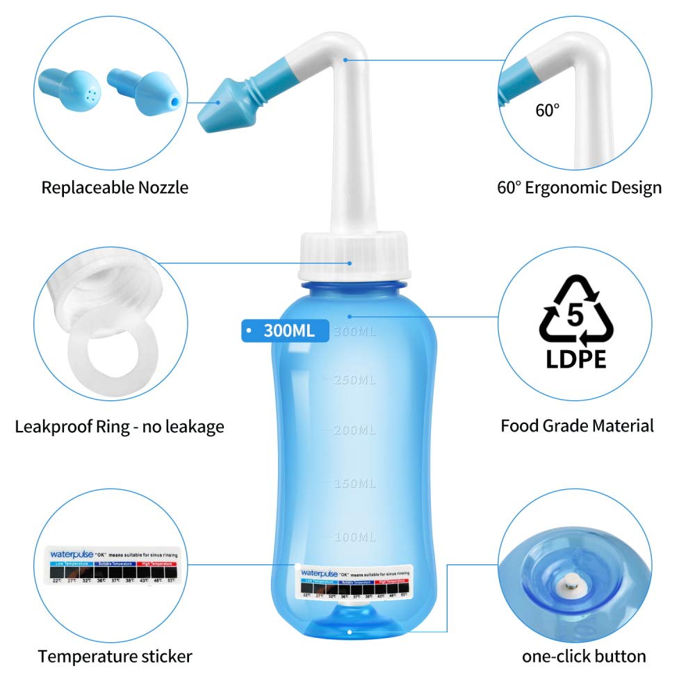 - Safe & Non-toxic - Nasal rinse bottle is made of food-grade material, BPA free, dishwasher safe. Water pulse nasal wash salt is finely ground salt, it is easy to dissolve and wash your nose with no pain. A rinse nose bottle with 300 ML capacity is portable and enough to clean the nose once.
