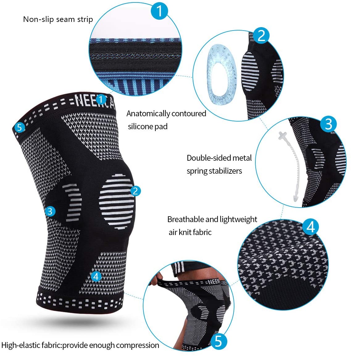 ✅UPGRADED DESIGN--- Overcome the defects of similar products. Medical-grade knee braces with no allergies and itchiness. Non-slip silicone strips and high-elastic fabric to avoid up and down sliding and tumbling during exercise.Three-dimensional structure of woven, breathable, fast-dry and absorbing sweat, lightweight.